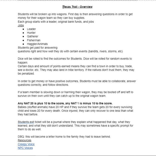 This creation is one of the custom lessons I am the most proud of. History can be a boring subject for students, so I aimed to fix that. Getting inspiration from The Oregon Trail and Dungeons and Dragons, I created a hands on, interactive adventure for students.